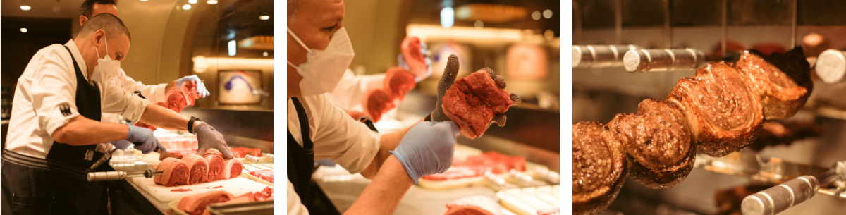 シュラスコを一番美味しい状態で召し上がっていただくために、焼いたお肉は5分以内にお客様に食べていただくことにこだわっています。焼きたてが最も美味しいからです。お肉をサーブするパサドールは、お客様とコミュニケーションとりながらお皿の空き状況や食べるペースを確認し、常に最高の状態のシュラスコをお持ちするように心がけています。部位によって切る厚さを決めており、一番美味しく食べれるように徹底しています。